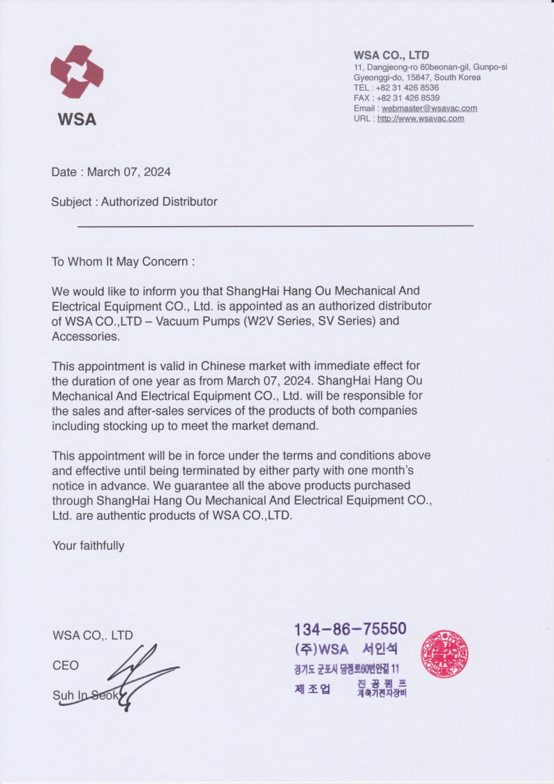 ShangHai HangOu Mechanical And Electrical Equipment Co.,Ltd > News Center > News > 2024年韓國WOOSUNG工廠WSA工廠授權上海航歐中國區代理